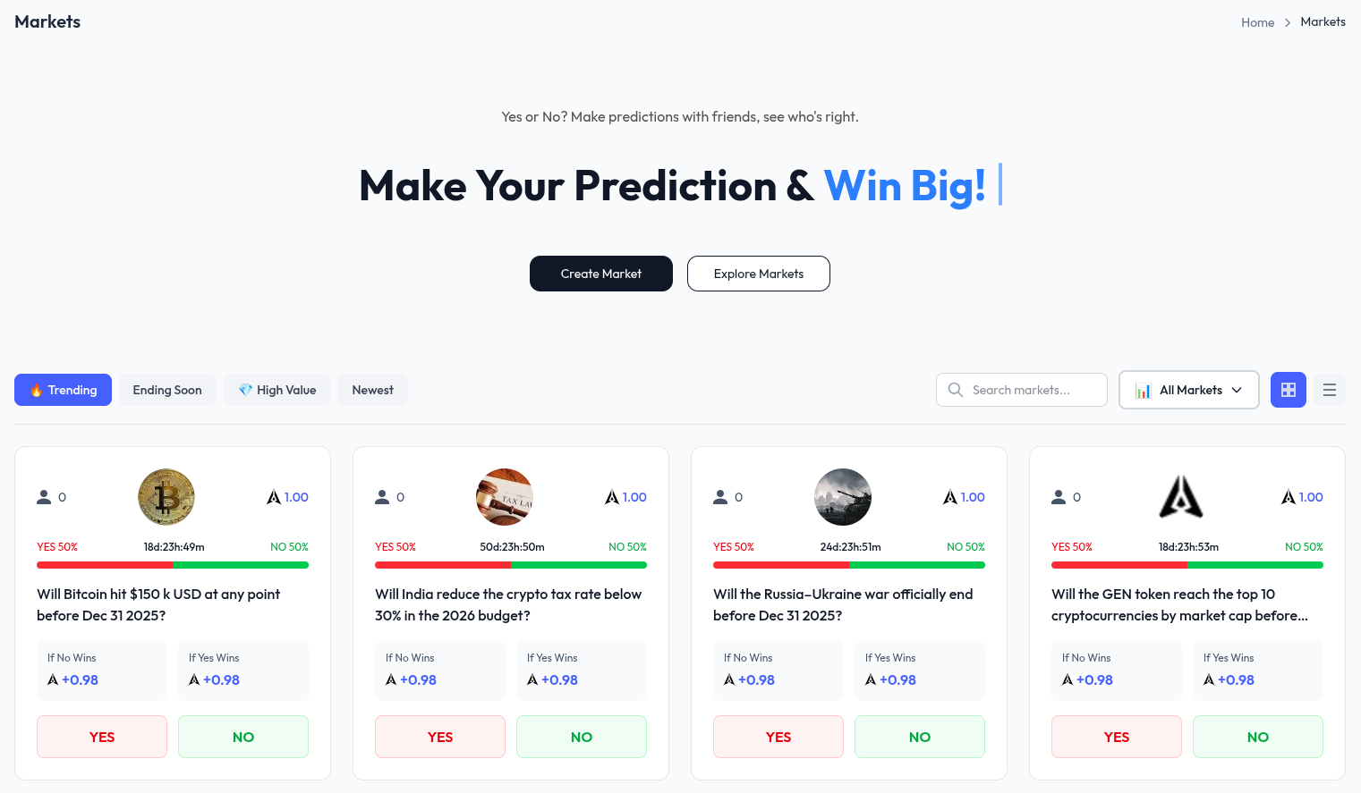 Browse the available markets and click on one that interests you. Connect your wallet if you haven't already, ensure you have enough GEN tokens (at least the market's price per share), then click either 'YES' or 'NO' to place your bet. Your bet amount will be deducted from your wallet, and you'll receive shares in the outcome you chose.